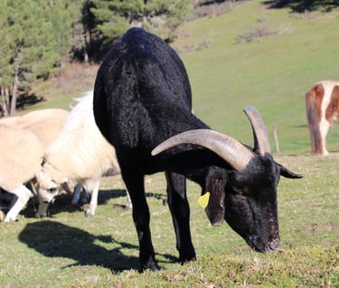 A Seitán le encanta hacer travesuras cabriles como subirse a lugares elevados, ponerse a dos patas para comer de las ramas más altas de los árboles o robar comida al resto del rebaño. Es muy tranquilo y tímido, pero cuando se siente cómodo te pide que le rasques entre los cuernecetes, porque él no llega.